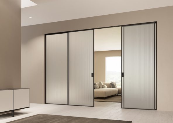 Delineo, nello specifico, si caratterizza per il vetro contornato da un profilo in alluminio con sistema di scorrimento a parete e a soffitto.