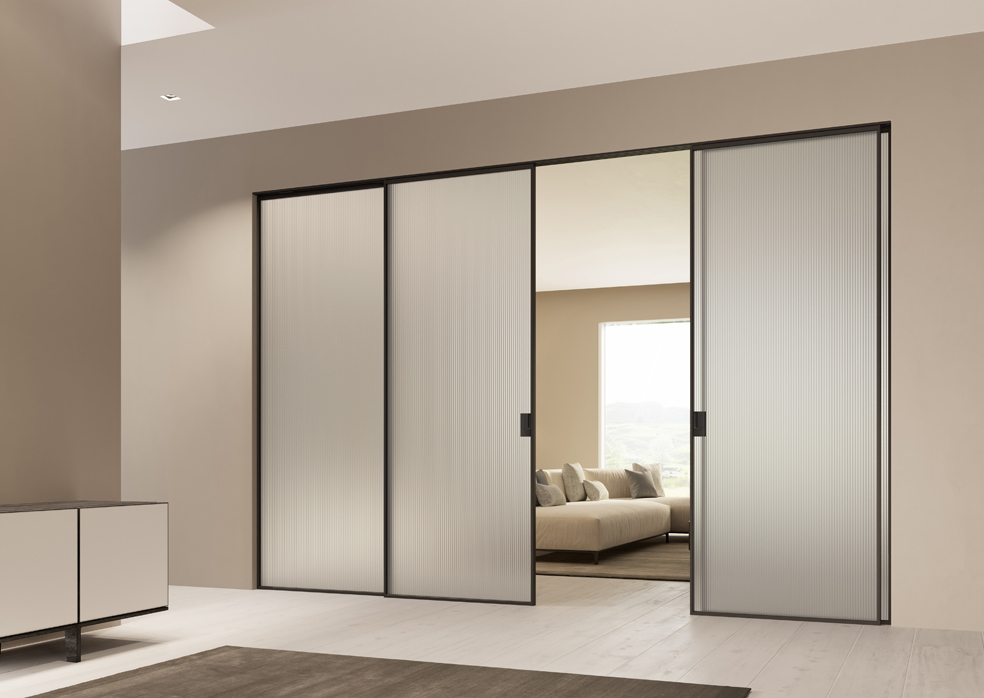 La profilatura è disponibile in alluminio anodizzato, laccata nero, bianco, bianco optical, Grigio Lux, Tortora, Ghisa o in tre esclusive tonalità metallizzate: vulcano, platino e perla. È possibile scegliere tra una vasta gamma di cristalli: extrachiari, riflettenti e laccati – questi ultimi proposti in 17 varianti di colore e nelle versioni a specchio. Inoltre, questo modello offre la possibilità di accoppiare due tipologie di vetro sulla stessa anta creando un effetto double-face, abbinando ad esempio un lato a specchio e un lato laccato.