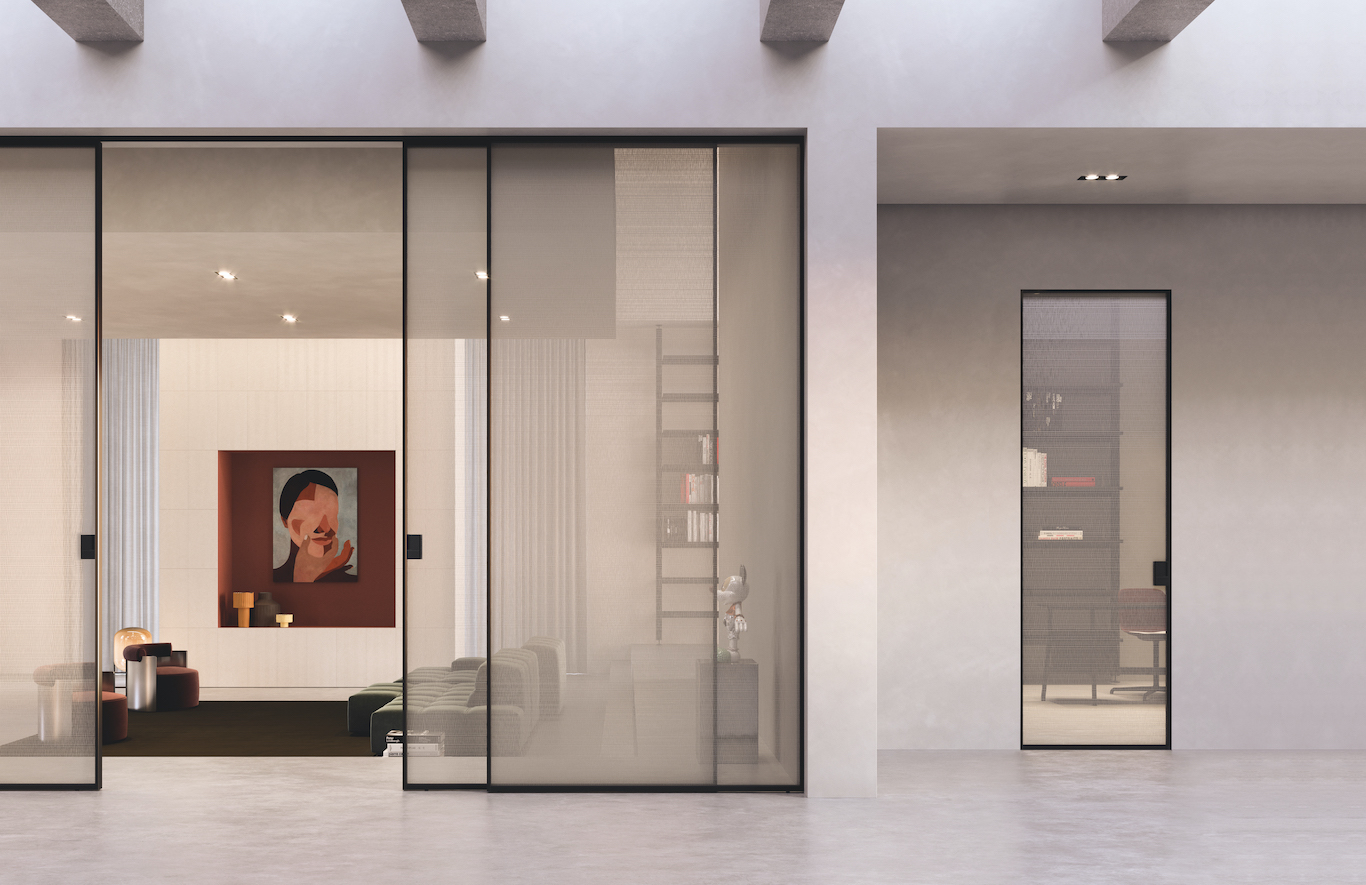 Delineo, nello specifico, si caratterizza per il vetro contornato da un profilo in alluminio con sistema di scorrimento a parete e a soffitto.