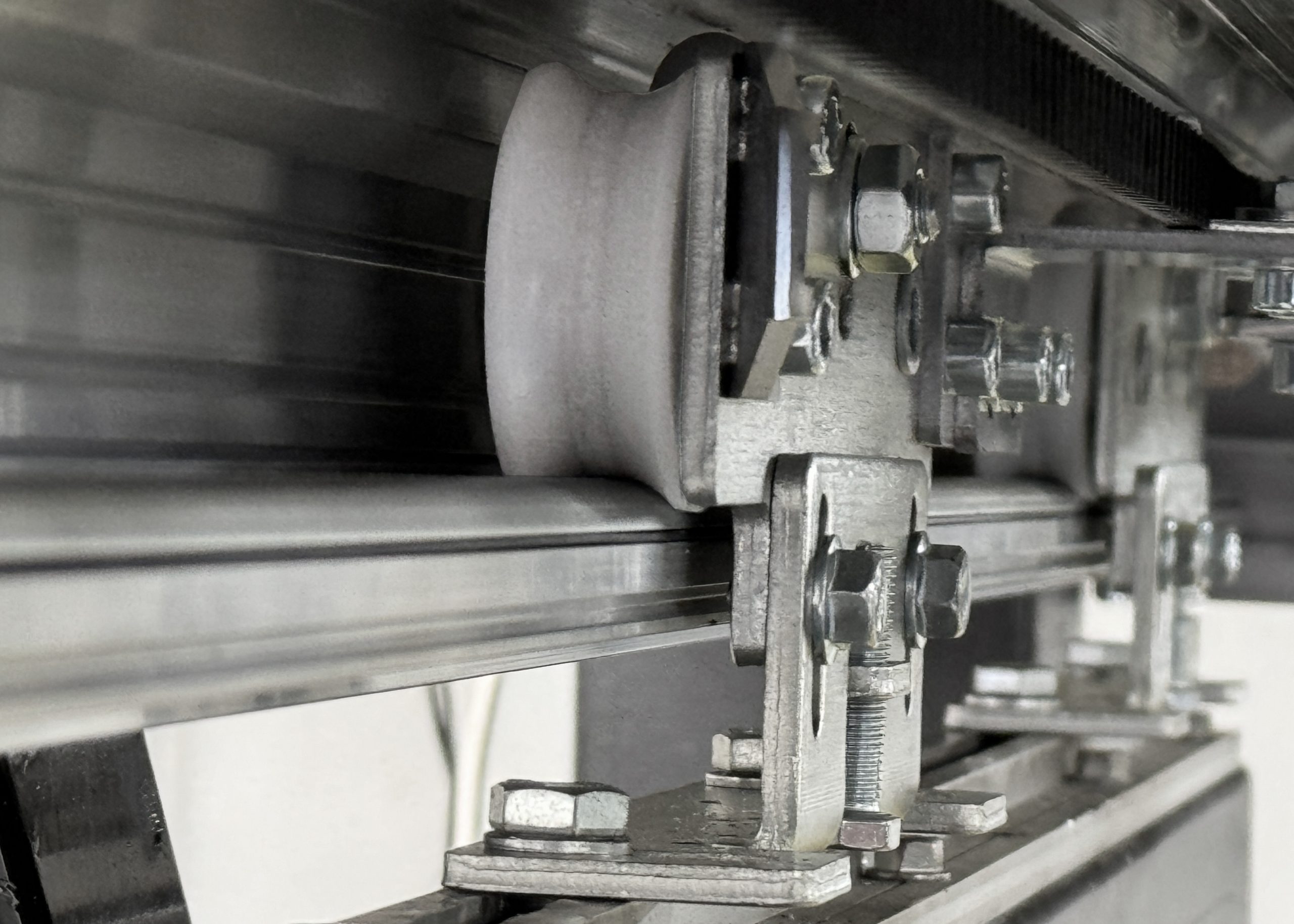 La cinghia è orizzontale per garantire le dimensioni compatte (altezza 100 mm), il profilo di scorrimento è separato ed ammortizzato per una