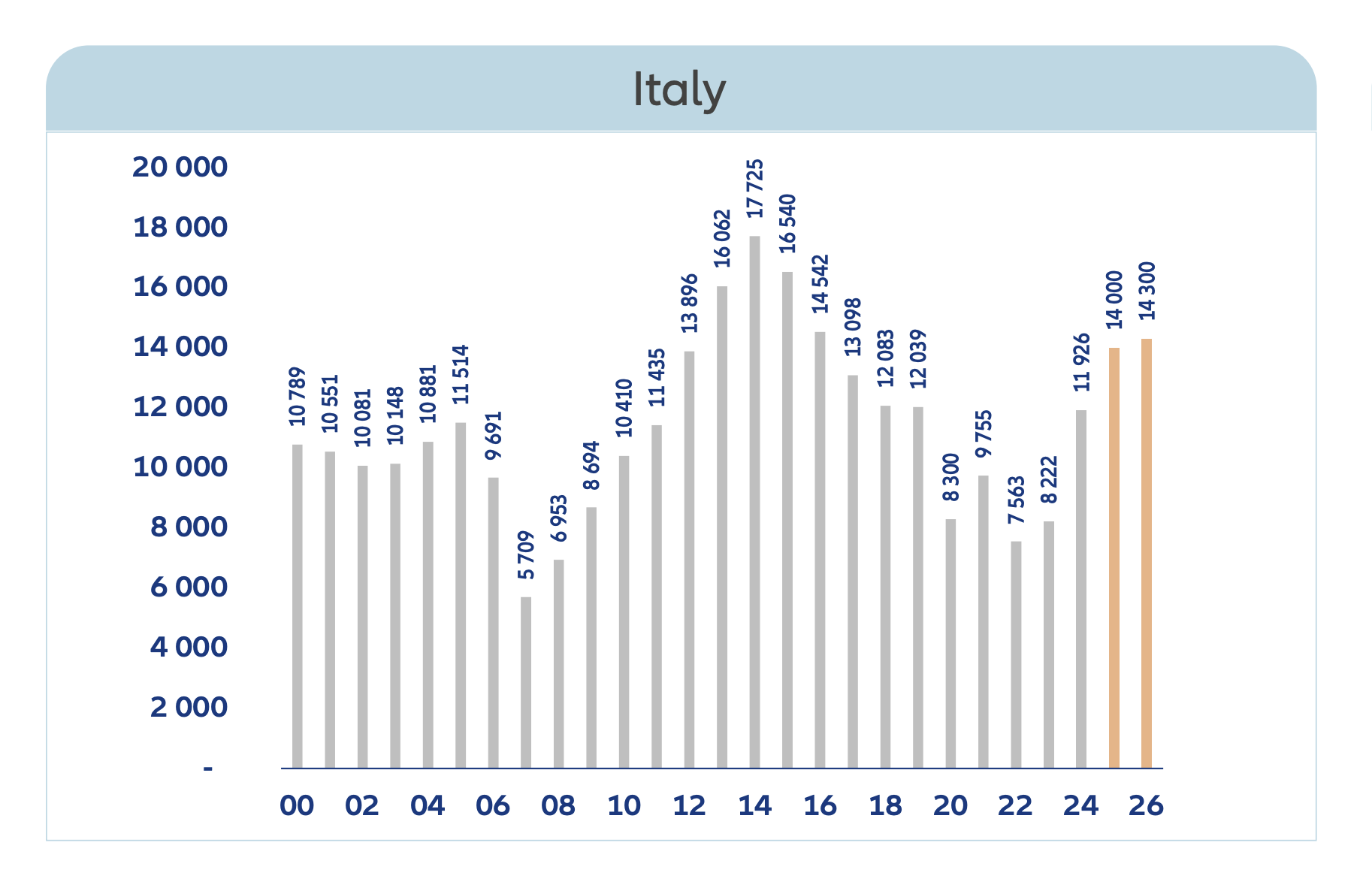 Per l’intero 2025 si prevede un incremento del +35% su base annua, pari a circa 13.000 casi, sulla base della stima rivista per il 2024 (9.612 casi). Si tratta del terzo anno consecutivo di crescita, dopo il +17% del 2024 e il +9% del 2023.