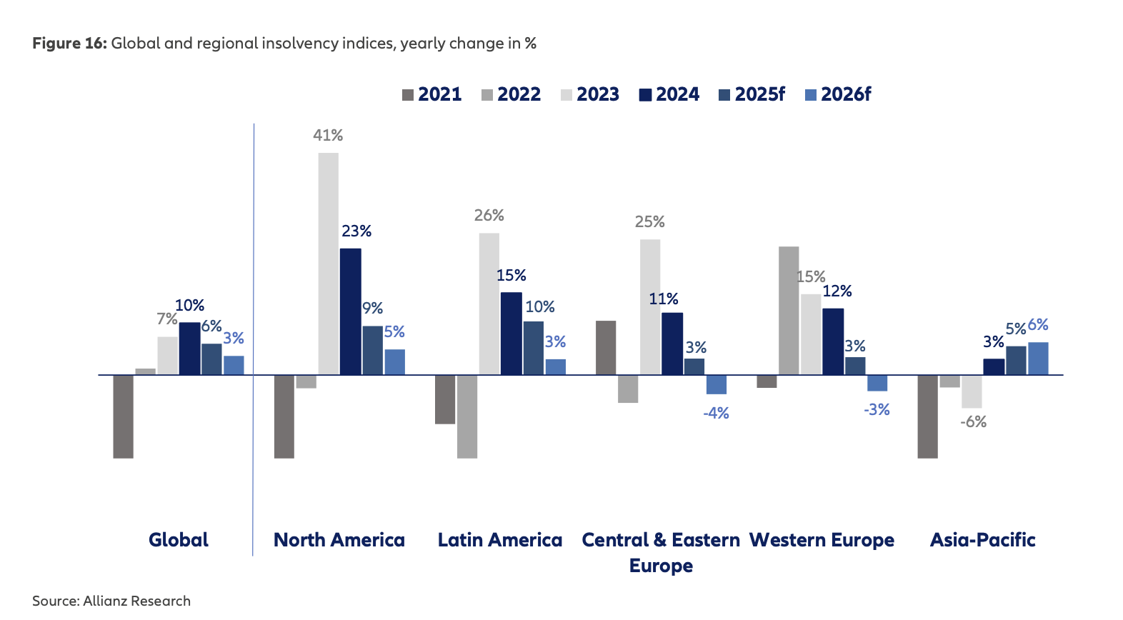Insolvenze aziendali: + 35% nel 2025. Costruzioni tra i settori più vulnerabiliPubblicato da Allianz Trade  l’ultimo Insolvency Report; studio che analizza l’impatto dei recenti dazi statunitensi e dei cambiamenti nel commercio globale sulle insolvenze aziendali, e presenta le nuove previsioni fino al 2027.