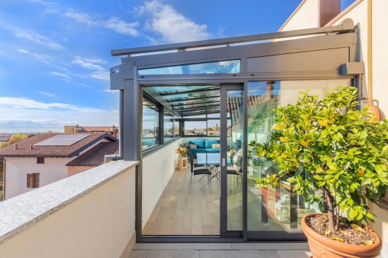 BT Glass ha realizzato a Tradate, in provincia di Varese, una serra bioclimatica G120 che trasforma un terrazzo all’ultimo piano in uno spazio vivibile tutto l’anno. La struttura, larga 8 metri e profonda 3, con altezza di 2,4 metri, è costruita con profili in alluminio a taglio termico e ospita sei serramenti Schüco serie G50 (AWS 65), garantendo prestazioni elevate di isolamento termoacustico. La copertura in vetro camera triplo e le tende integrate, sia sul tetto sia sui fronti vetrati, consentono un controllo preciso dell’irraggiamento e del microclima interno. Il progetto è stato seguito dal Project Manager Serre di BT Glass, con il supporto dell’ufficio tecnico e della squadra interna di posatori, per assicurare cura sartoriale dei dettagli e qualità esecutiva. Il risultato è uno spazio luminoso, immersivo e perfettamente integrato con il paesaggio, come confermato anche dai committenti, che sottolineano la capacità dell’azienda nel trasformare il terrazzo in un living esclusivo fruibile in ogni stagione. L’intervento riflette la filosofia BT Glass, orientata a coniugare trasparenza, luce e benessere abitativo, grazie a soluzioni su misura e a un controllo diretto dell’intero processo produttivo.