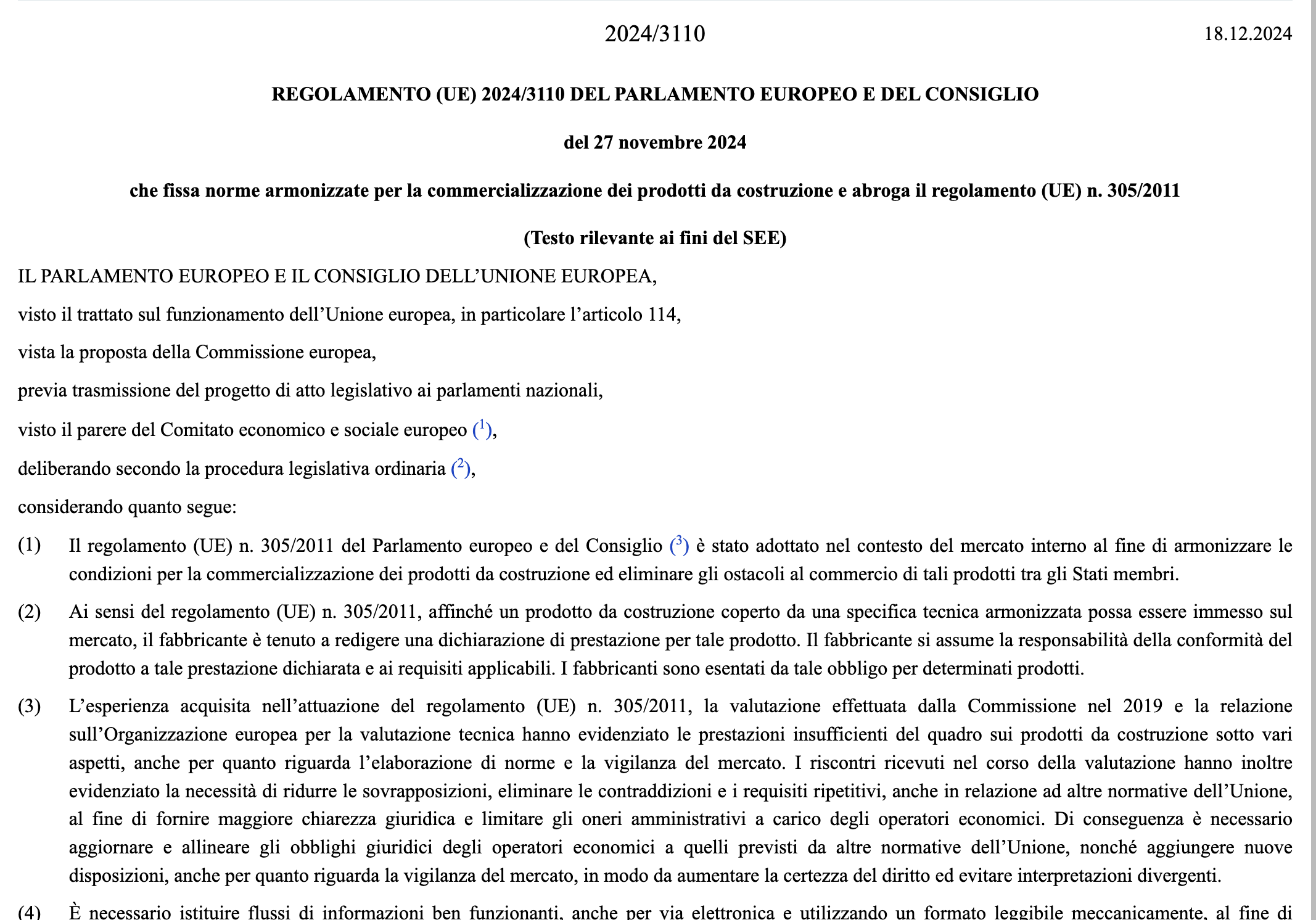 - Per “prodotto da costruzione” si deve intendere: “qualsiasi elemento fisico avente o meno una forma, compresi prodotti fabbricati tramite stampa 3D, oppure un kit immesso sul mercato, anche mediante fornitura al cantiere, per essere incorporato in modo permanente in opere di costruzione o in parti di esse, fatta eccezione per gli elementi che sono necessariamente integrati innanzitutto in un kit o in un altro prodotto da costruzione prima di essere incorporati in modo permanente in opere di costruzione” (v. n. 1 dell’art. 3 del Regolamento).