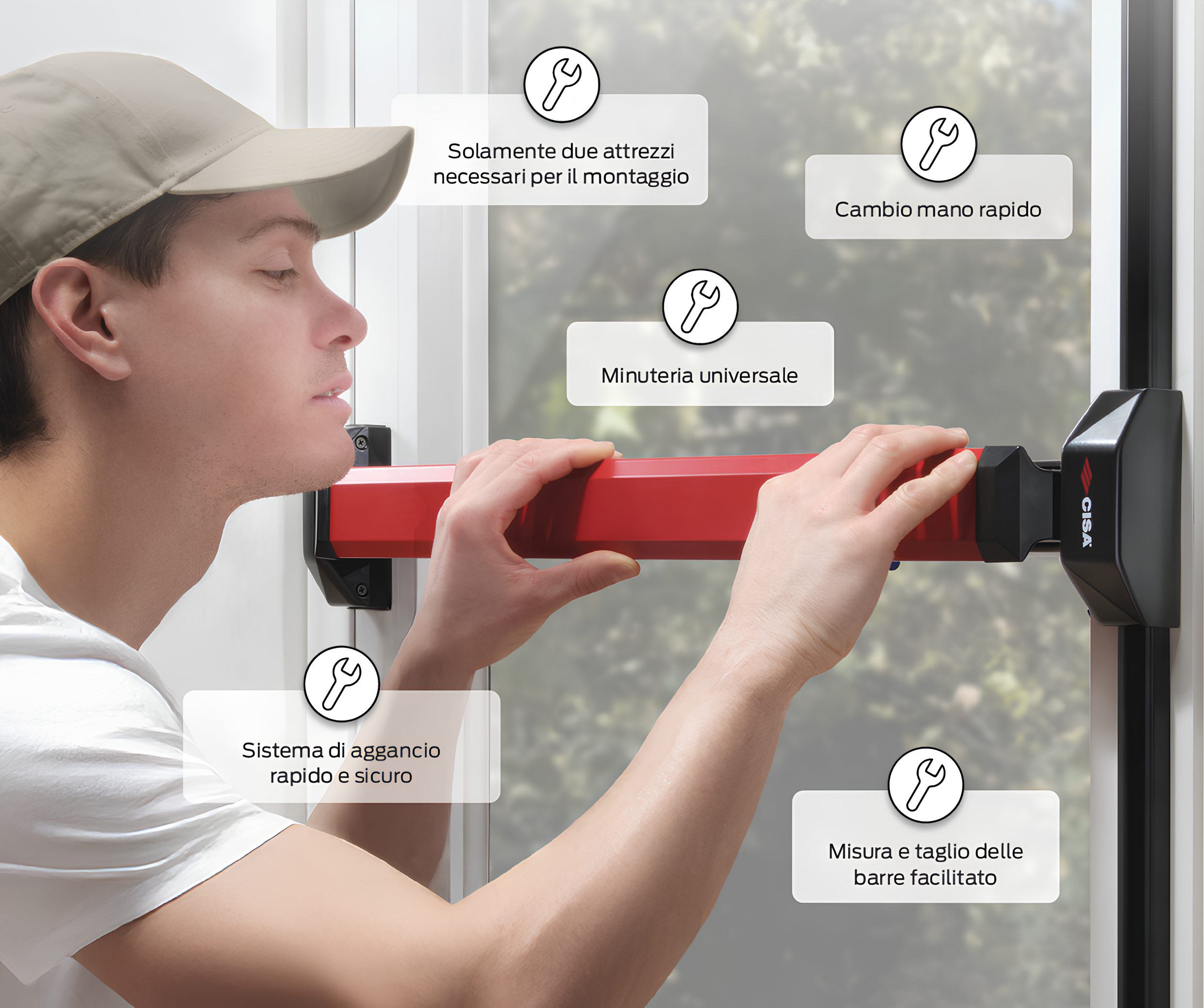 Con Alpha, CISA ripensa il design e l’installazione del maniglione antipanico: un sistema modulare, con un ridotto numero di componenti e di minuteria, e due soli attrezzi per l’installazione, progettato per semplificare al massimo il montaggio. Non si tratta di un’evoluzione del passato, ma di una nuova filosofia per rendere l’installazione più snella, rapida, facilitata e senza rischio di errori.