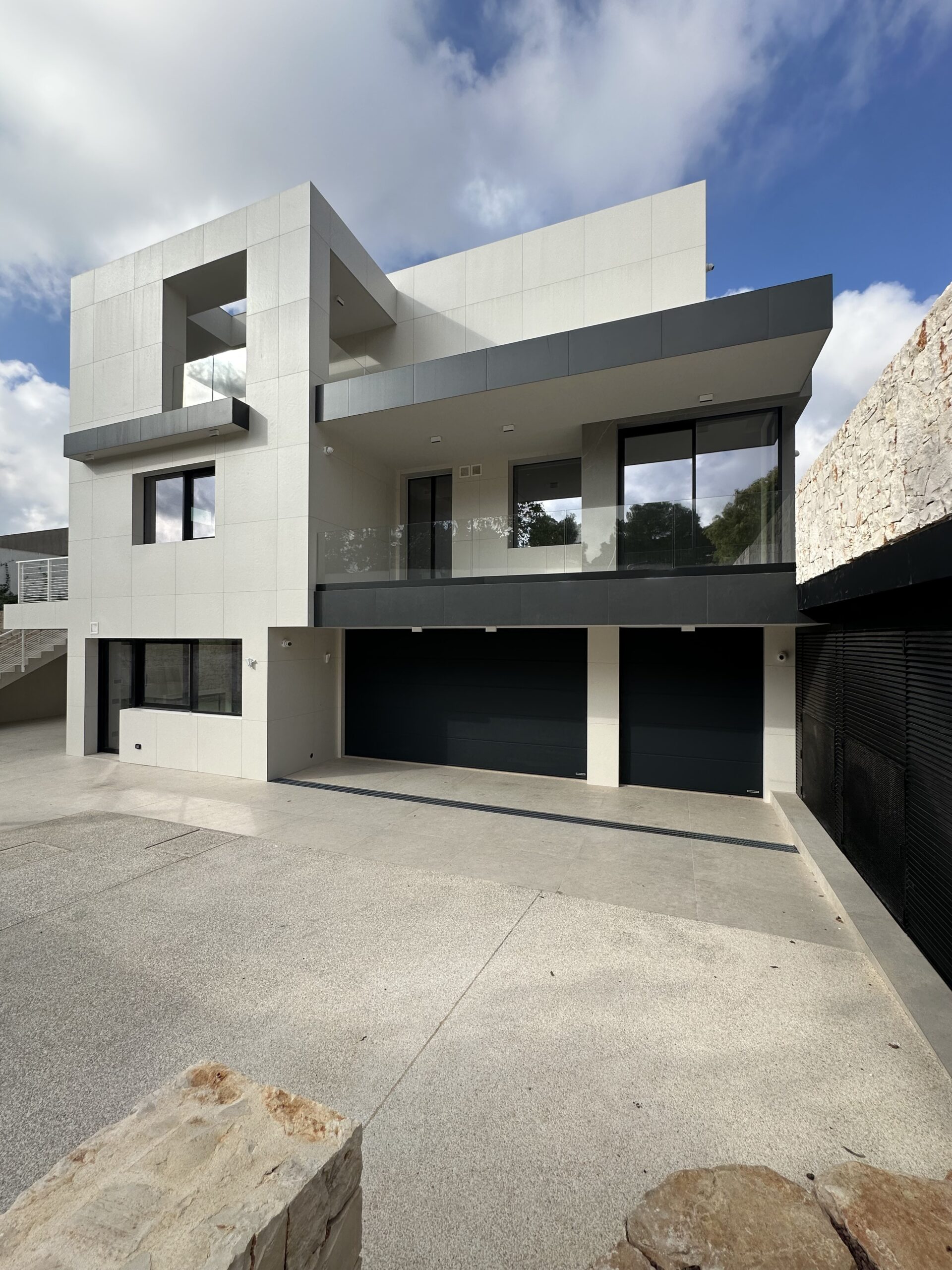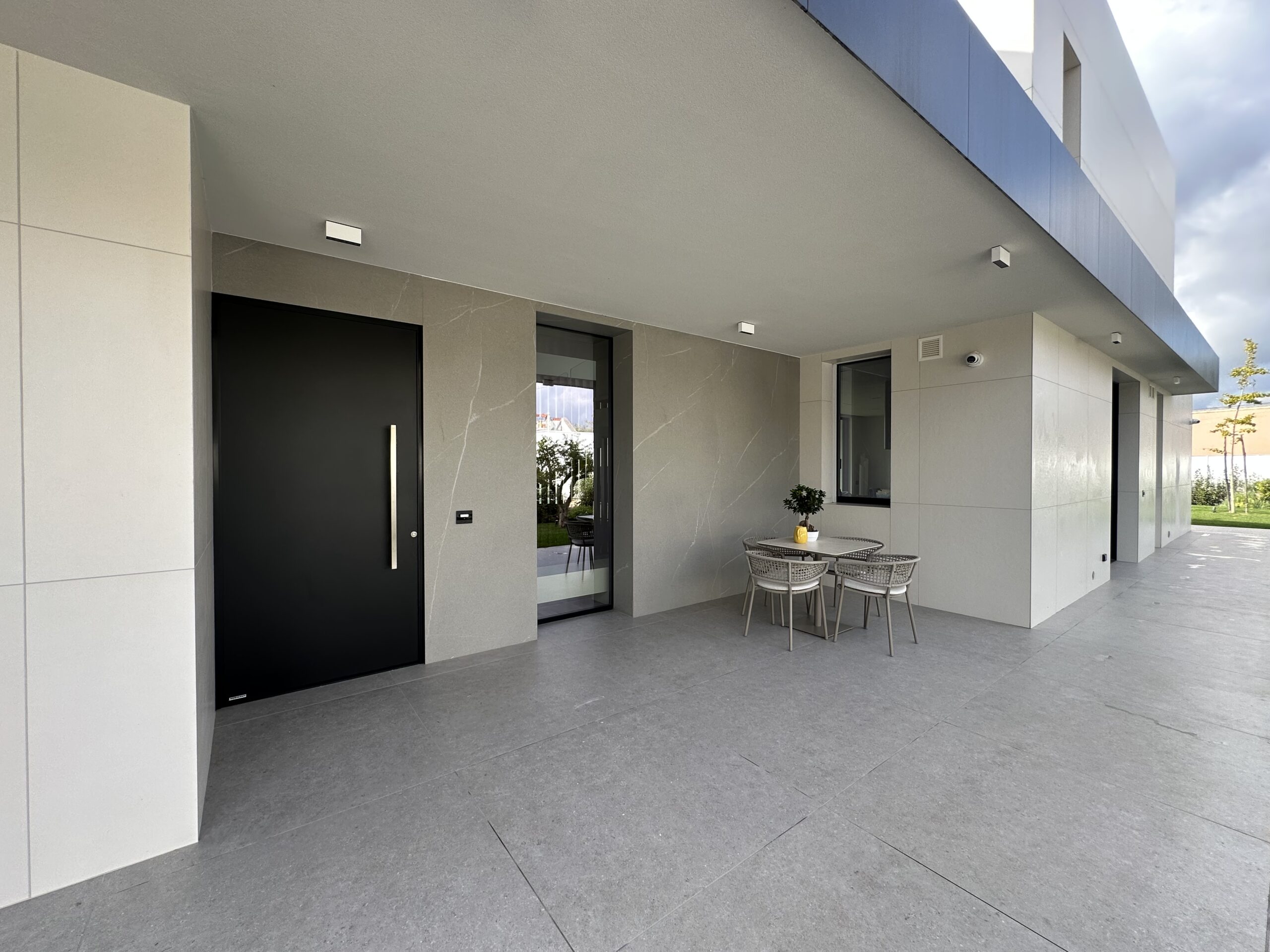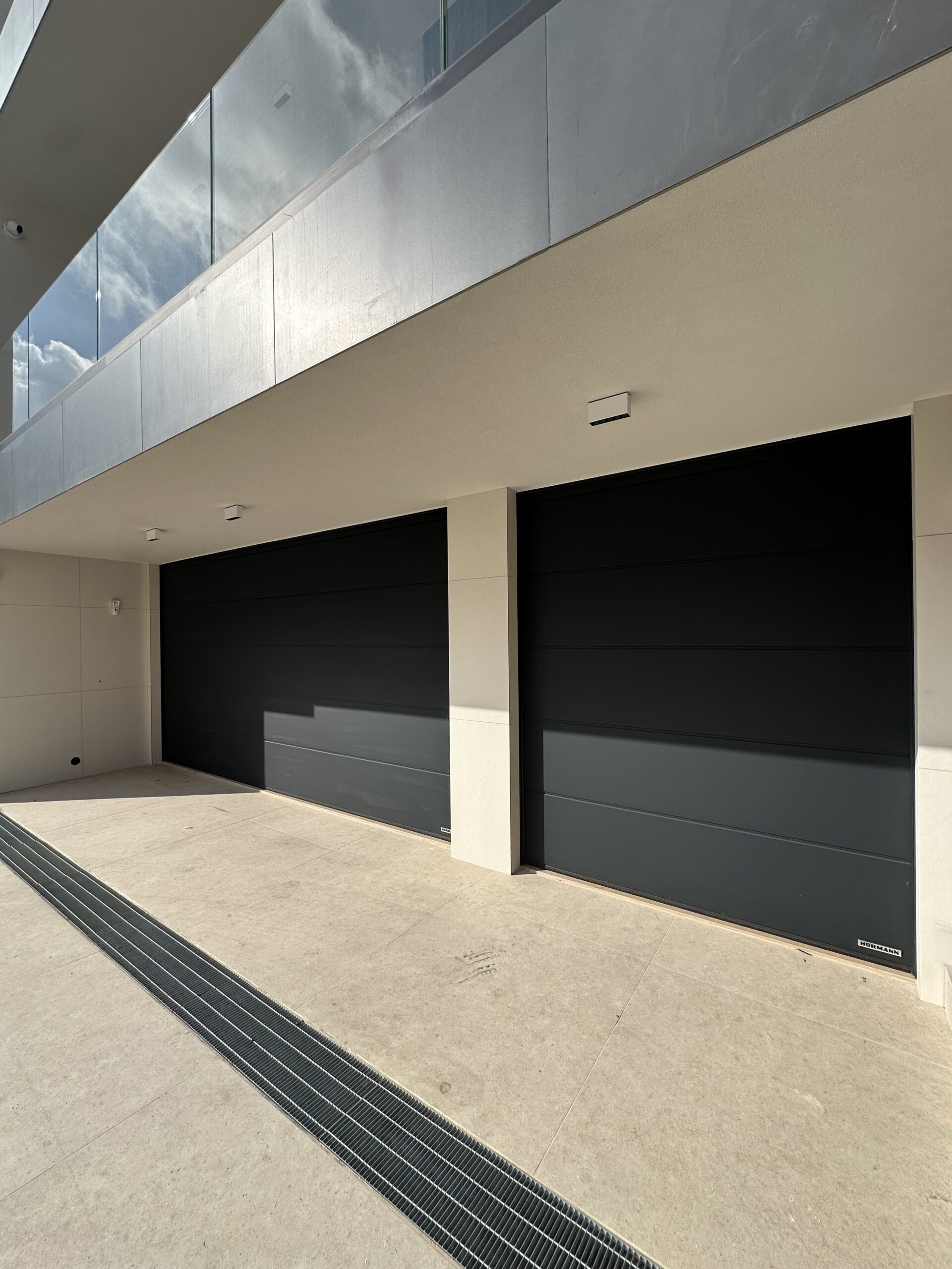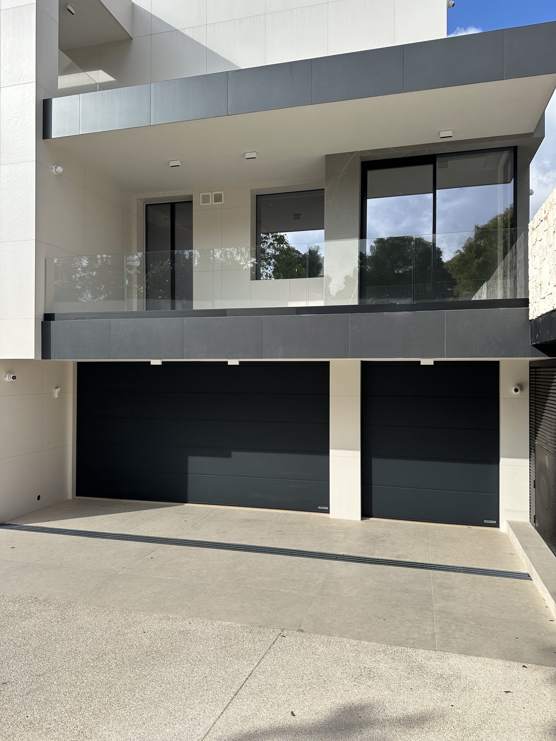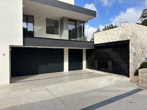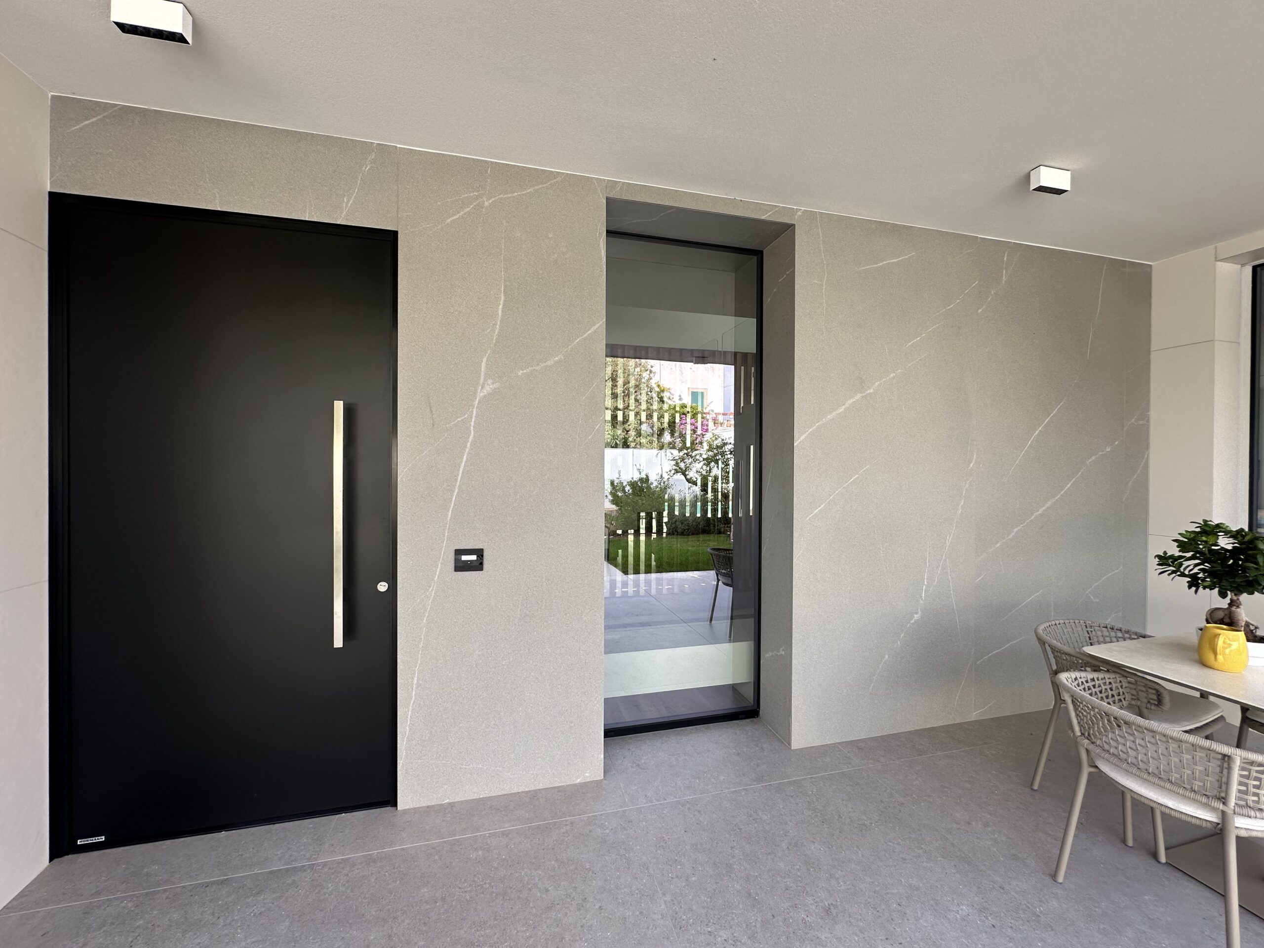 La villa è dotata di due portoni sezionali LPU 42, scelti per affidabilità, personalizzazione e prestazioni termoacustiche: pannelli da 42 mm, lamiera a doppia parete con schiuma poliuretanica, ottima tenuta e scorrimento silenzioso, azionati dal motore SupraMatic P Serie 4. Il portoncino d’ingresso ThermoSafe, selezionato nel modello Motivo 860 con finitura nera opaca, unisce design, praticità e sicurezza RC3, grazie al telaio in alluminio a taglio termico e alla serratura motorizzata con autobloccaggio. Con una trasmittanza fino a UD ≥ 0,8 W/m2K, assicura isolamento di livello superiore. L’intervento conferma come una corretta integrazione tra architettura, tecnologia e materiali performanti possa elevare sia il comfort sia la qualità estetica dell’abitare.