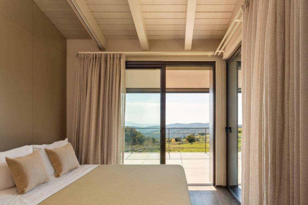 Al piano primo trovano spazio sei sistemi scorrevoli Schüco ASE 51 PD, scelti per il design minimale e la possibilità di incassare completamente il telaio perimetrale nelle pareti, creando un effetto visivo “incorniciato” e massimizzando la continuità tra interno ed esterno. La maniglia ergonomica, che permette lo sblocco dell’anta con una rotazione ridotta di soli 20°, contribuisce a rendere la movimentazione fluida e intuitiva.
