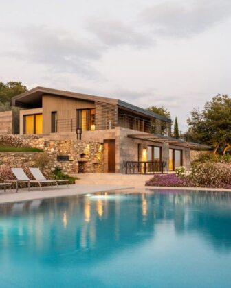 Inserita in un oliveto terrazzato, l’abitazione si integra con il versante a livello del basamento, mentre il volume del primo piano si solleva dal suolo, distinguendosi per la copertura metallica e i rivestimenti lignei. Anche la sistemazione del giardino e della piscina segue l’andamento naturale del terreno, rafforzando quell’equilibrio tra elementi naturali e architettura che costituisce il filo conduttore dell’intero progetto.