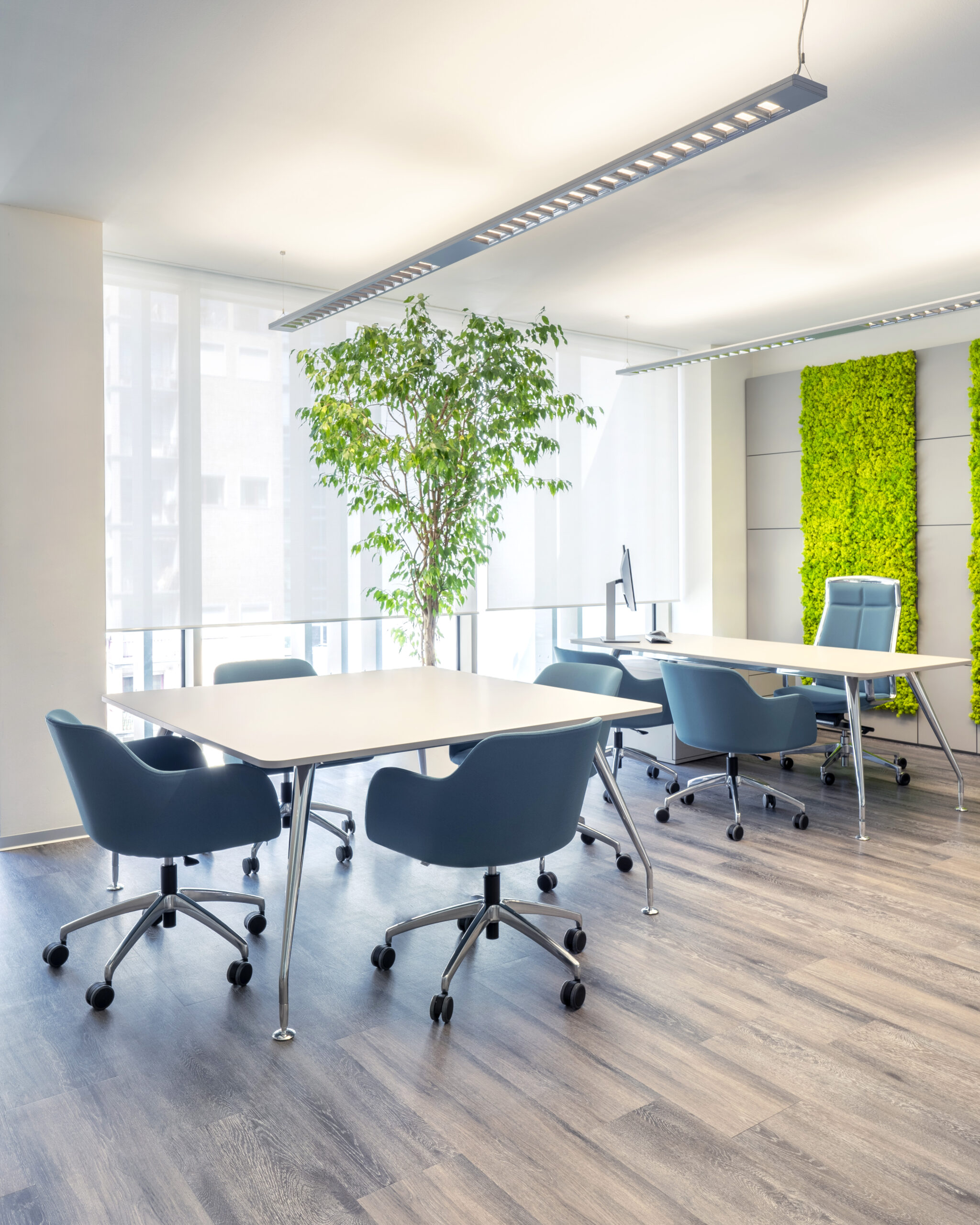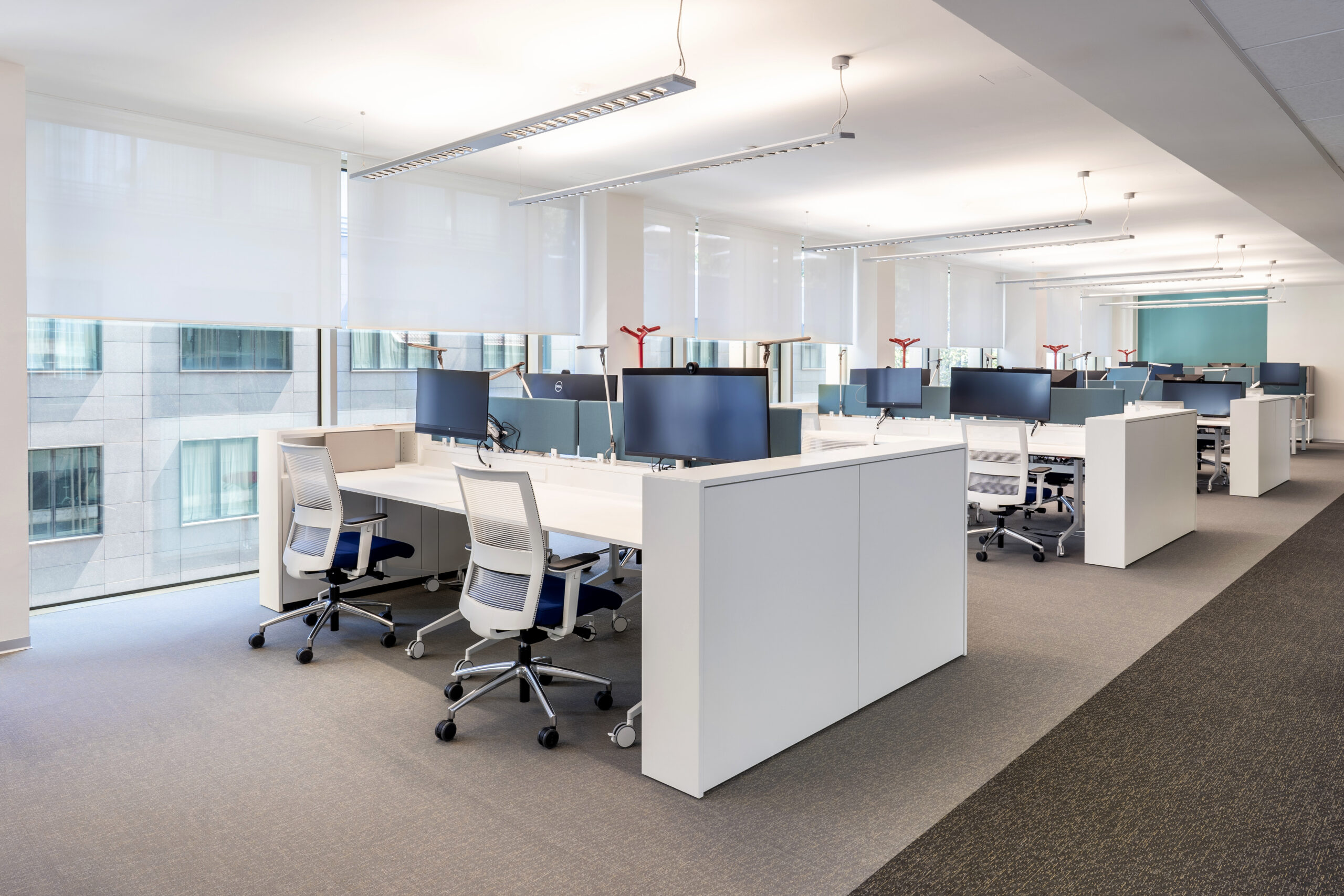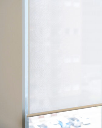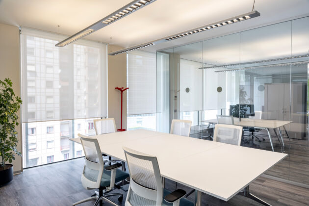 Per le tende è stato selezionato il tessuto Sunscreen Satinè 5500 con apertura del 4%, capace di offrire un buon equilibrio tra apporto di luce naturale, protezione dall’irraggiamento solare e comfort visivo per gli utenti degli uffici.