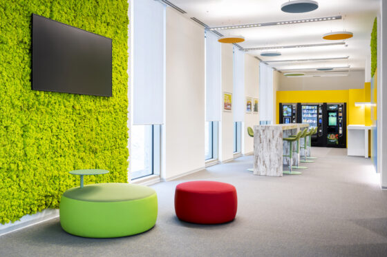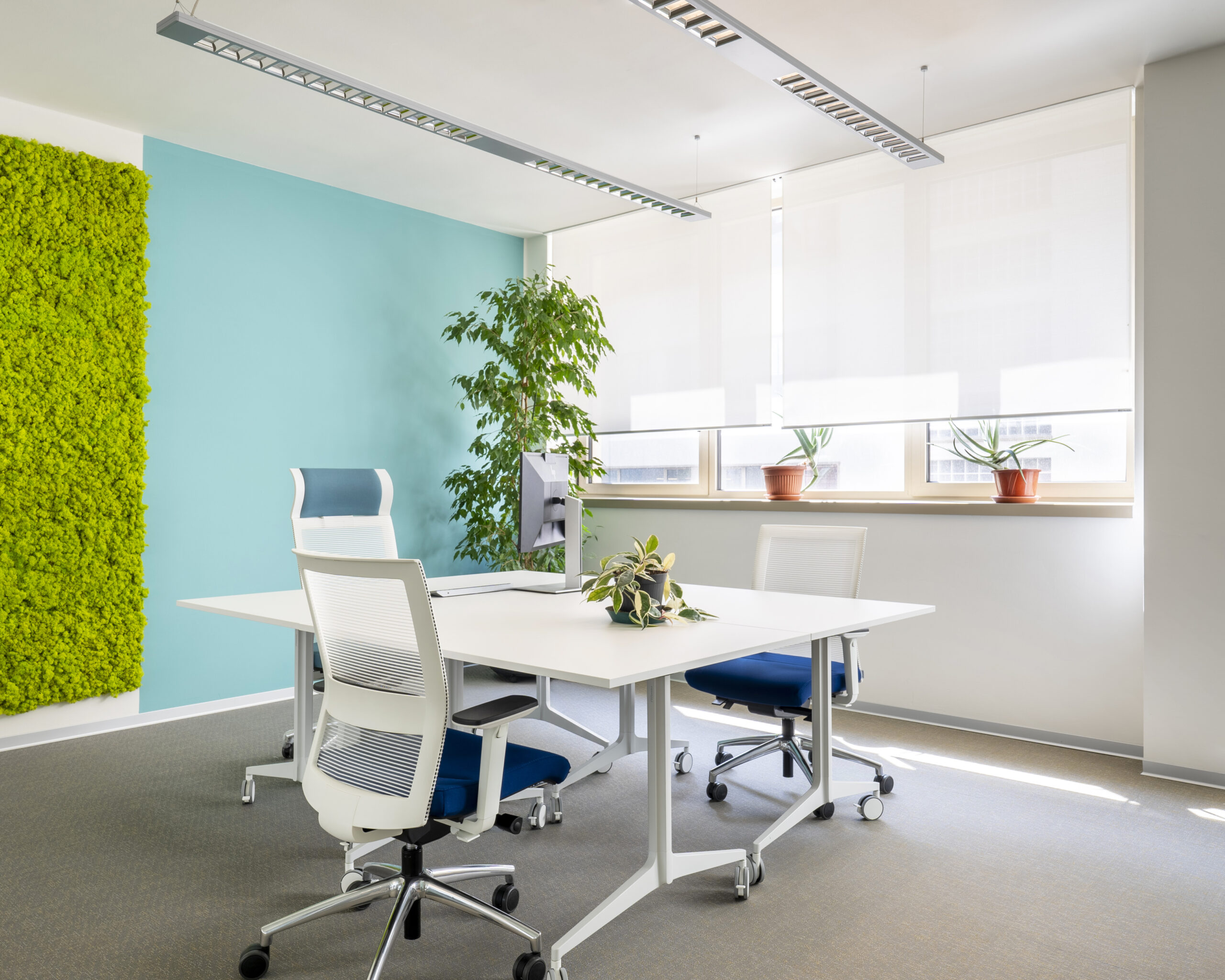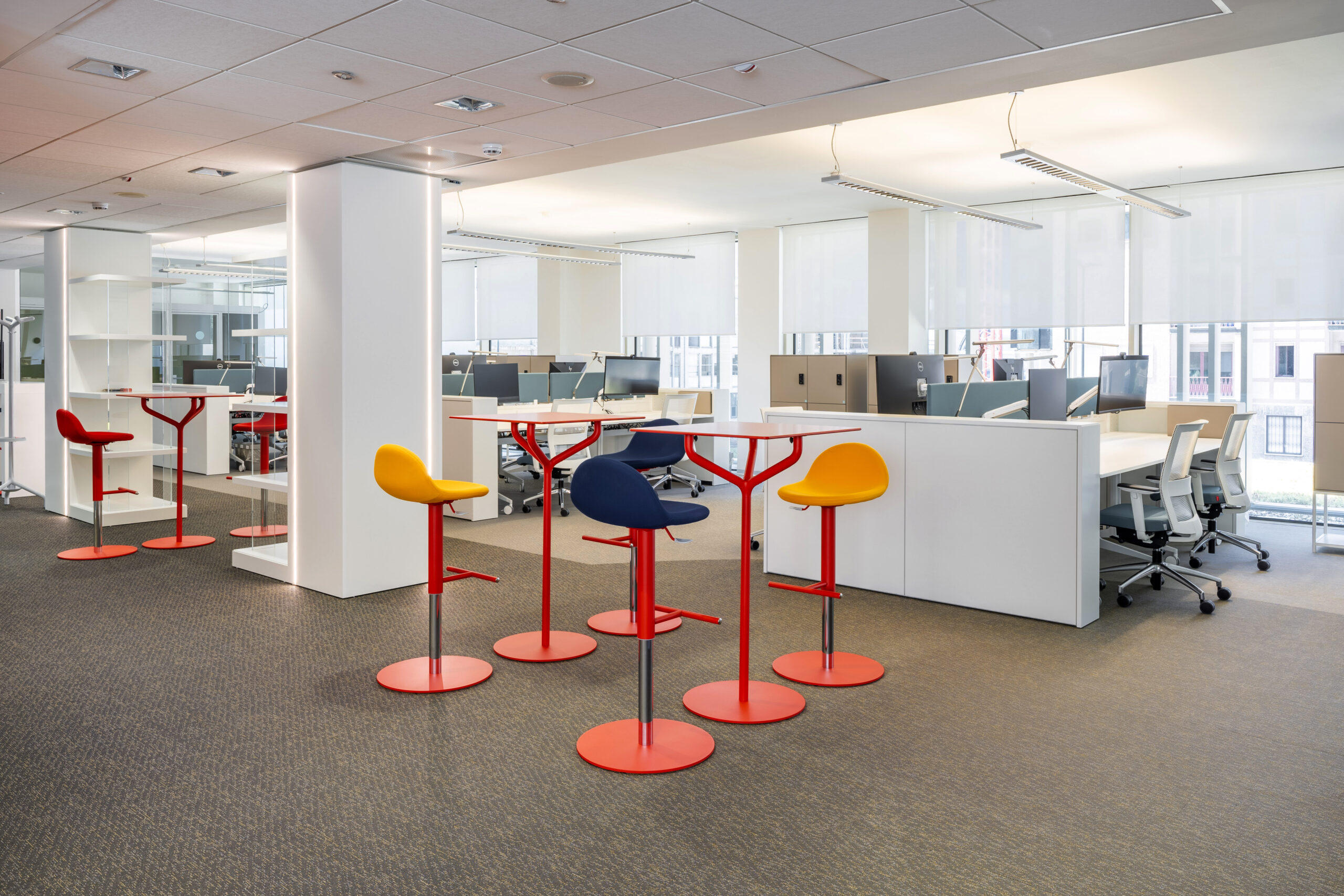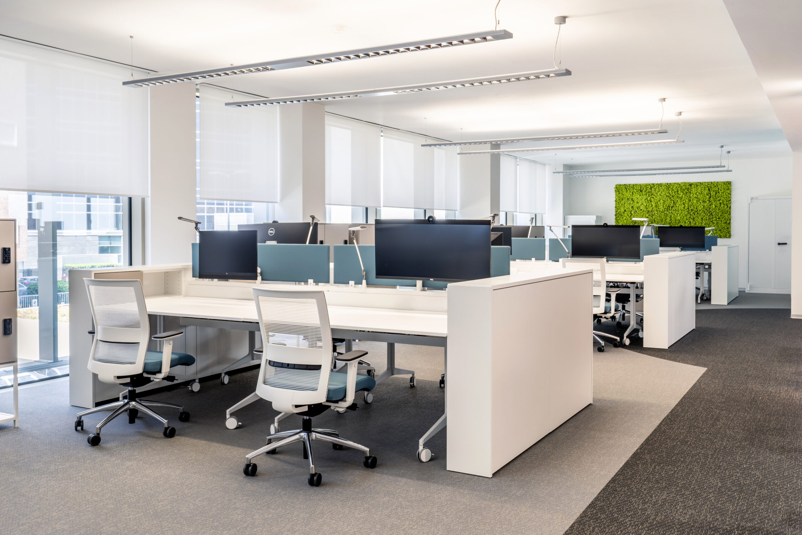 Per le tende è stato selezionato il tessuto Sunscreen Satinè 5500 con apertura del 4%, capace di offrire un buon equilibrio tra apporto di luce naturale, protezione dall’irraggiamento solare e comfort visivo per gli utenti degli uffici.