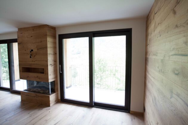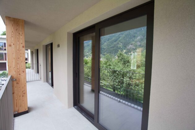 Per le logge e le grandi aperture verso l’esterno è stata invece adottata la serie Eku 170 AS TT, un sistema alzante scorrevole progettato per realizzare serramenti di grandi dimensioni. Le ampie superfici vetrate permettono di massimizzare l’ingresso di luce naturale e il rapporto visivo con il paesaggio circostante. Il sistema è dotato di ferramenta specifica che consente la movimentazione fluida di ante fino a 400 kg e di una soglia ribassata isolata, conforme alle normative sull’eliminazione delle barriere architettoniche.