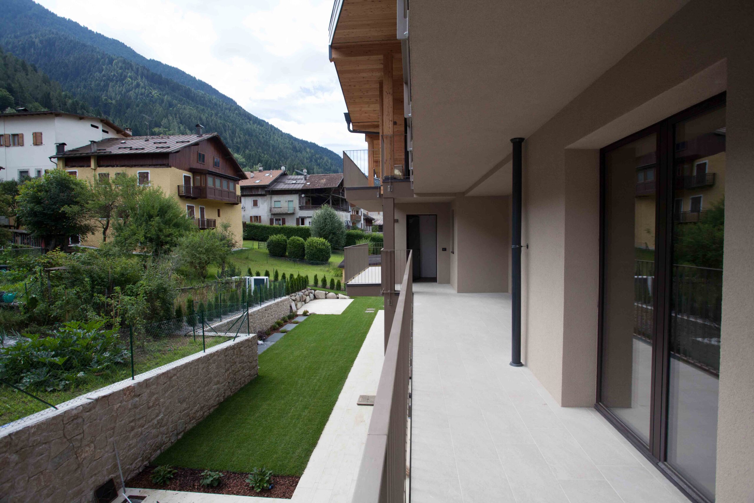 Il nuovo edificio si presenta come un volume compatto ma dinamico, caratterizzato da un attento equilibrio tra pieni e vuoti, aggetti e rientranze, logge e balconi che articolano le facciate e contribuiscono a definire un’immagine architettonica elegante e contemporanea. La composizione si fonda su un dialogo materico e cromatico tra elementi differenti: il basamento rivestito in pietra Geopietra richiama il linguaggio costruttivo del territorio, mentre le superfici intonacate nascondono il sistema di isolamento a cappotto.