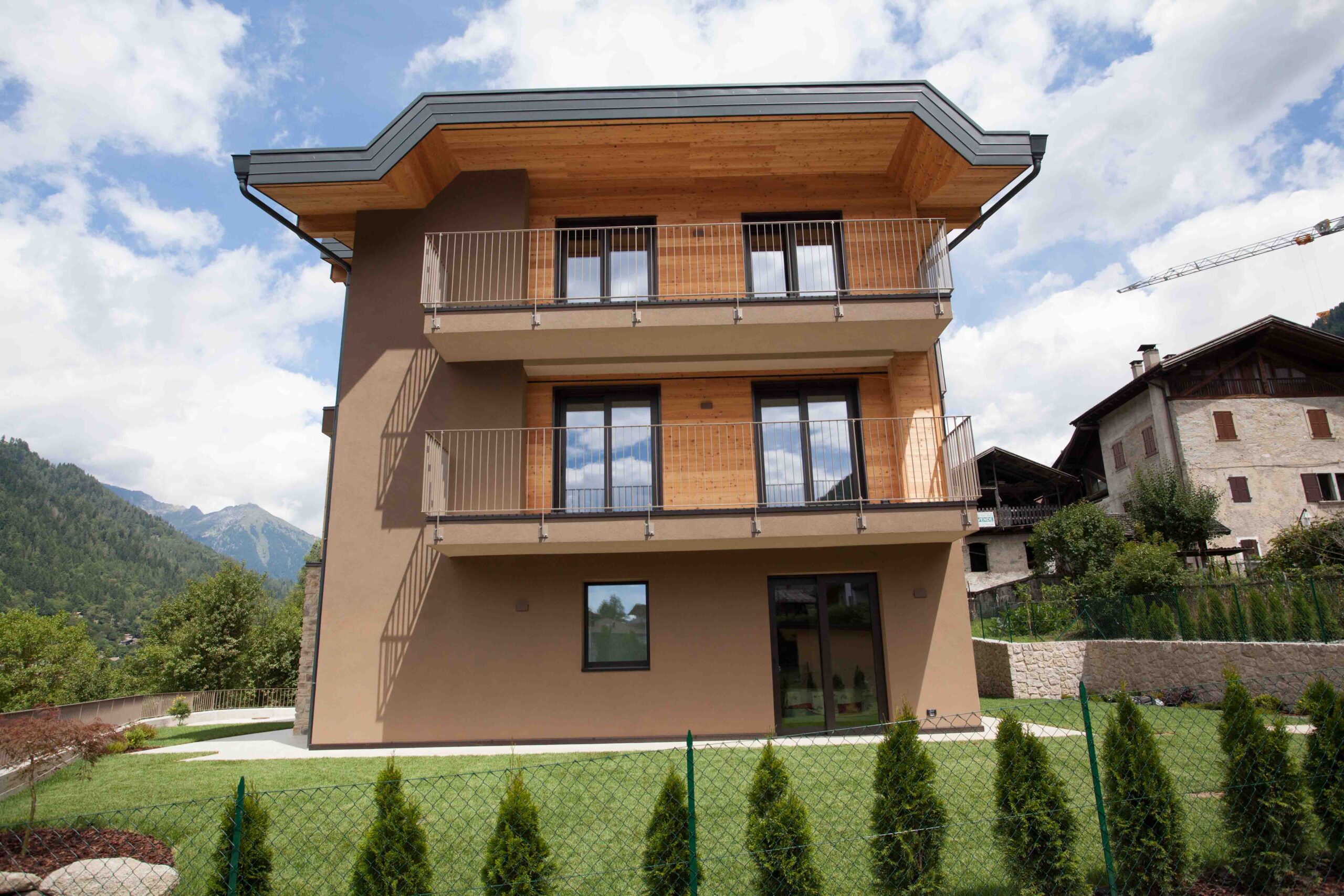 Il progetto costruttivo adotta una struttura mista: i solai sono realizzati in calcestruzzo armato, mentre i tamponamenti sono in X-LAM; l’ultimo piano è interamente costruito in legno. Il vano scala e l’ascensore, collocati nella parte centrale del volume, distribuiscono le otto unità residenziali. Il legno diventa protagonista anche negli elementi architettonici esterni, come i pilastri e la struttura della copertura, oltre che nei rivestimenti in larice. L’insieme di questi materiali, combinati con parapetti vetrati e metallici, conferisce all’edificio un’immagine solida ma allo stesso tempo leggera.