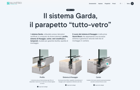 Ampio spazio è riservato anche alle linee prodotto di punta, Garda e Modular 2.0, presentate in modo approfondito con informazioni tecniche, configurazioni e possibilità di personalizzazione. A supporto della scelta, il sito integra anche un configuratore per valutare abbinamenti e soluzioni estetiche.