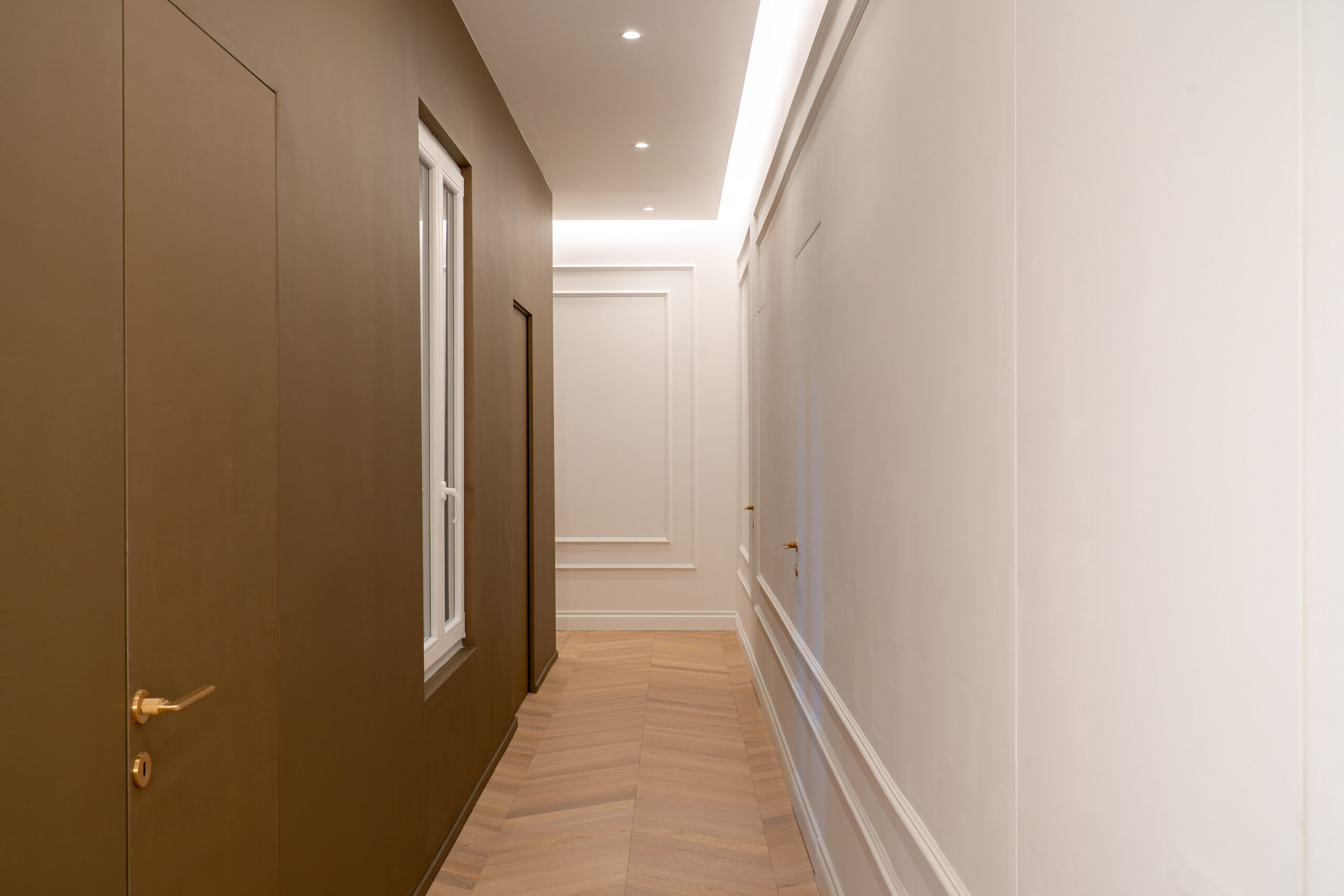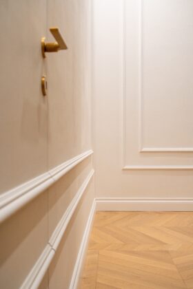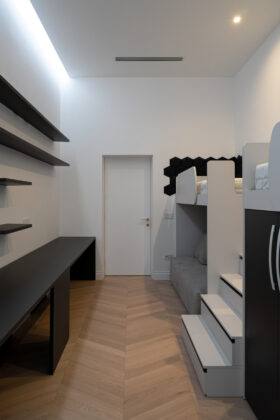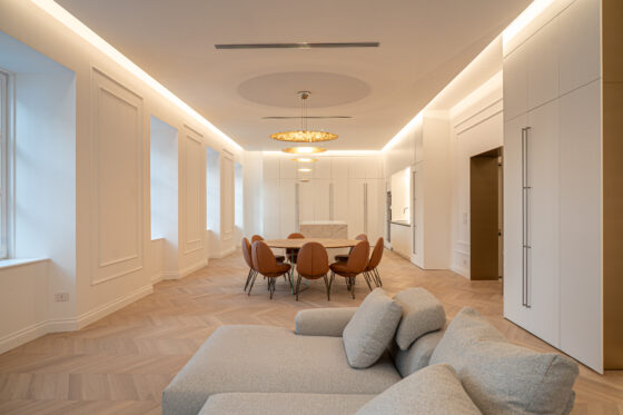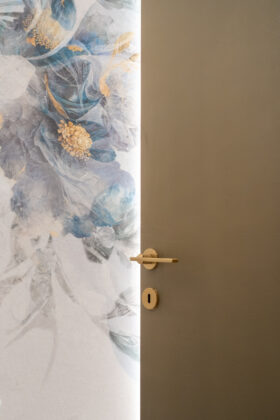 Un elemento rilevante del progetto è rappresentato dalla scelta delle porte interne, affidata a GD Dorigo. Tra le diverse opzioni disponibili, la selezione è ricaduta sulla collezione Eterea, individuata come soluzione adatta a integrarsi con i materiali presenti negli ambienti, tra cui il marmo Calacatta Gold e il parquet in rovere a spina di pesce.