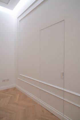 Nel progetto sono state utilizzate porte a filo parete, sia nella versione a battente sia nella variante scorrevole a scomparsa (Art. 11). Questa tipologia consente di ridurre la percezione dell’elemento porta all’interno dello spazio, favorendo una lettura più continua delle superfici verticali e contribuendo alla definizione di ambienti ordinati e coerenti.
