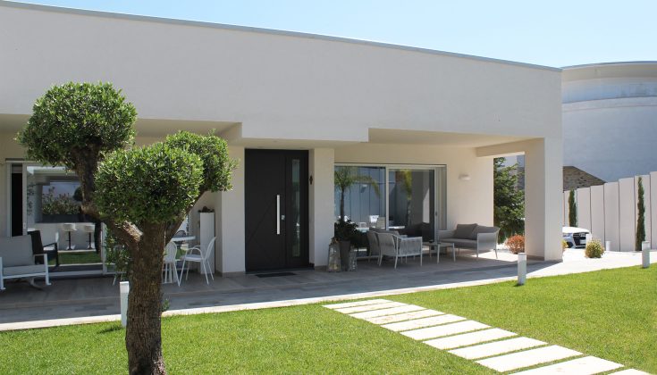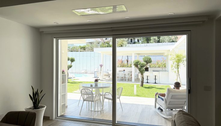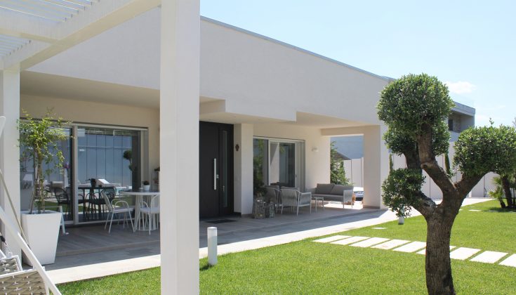L’uso calibrato di luce e ombra, reso possibile dalle profonde sporgenze di copertura e dalle ampie superfici vetrate, migliora la qualità della vita e dello spazio. Gli infissi in PVC Schüco diventano strumenti chiave per amplificare la connessione visiva con l’esterno e garantire efficienza energetica e comfort.